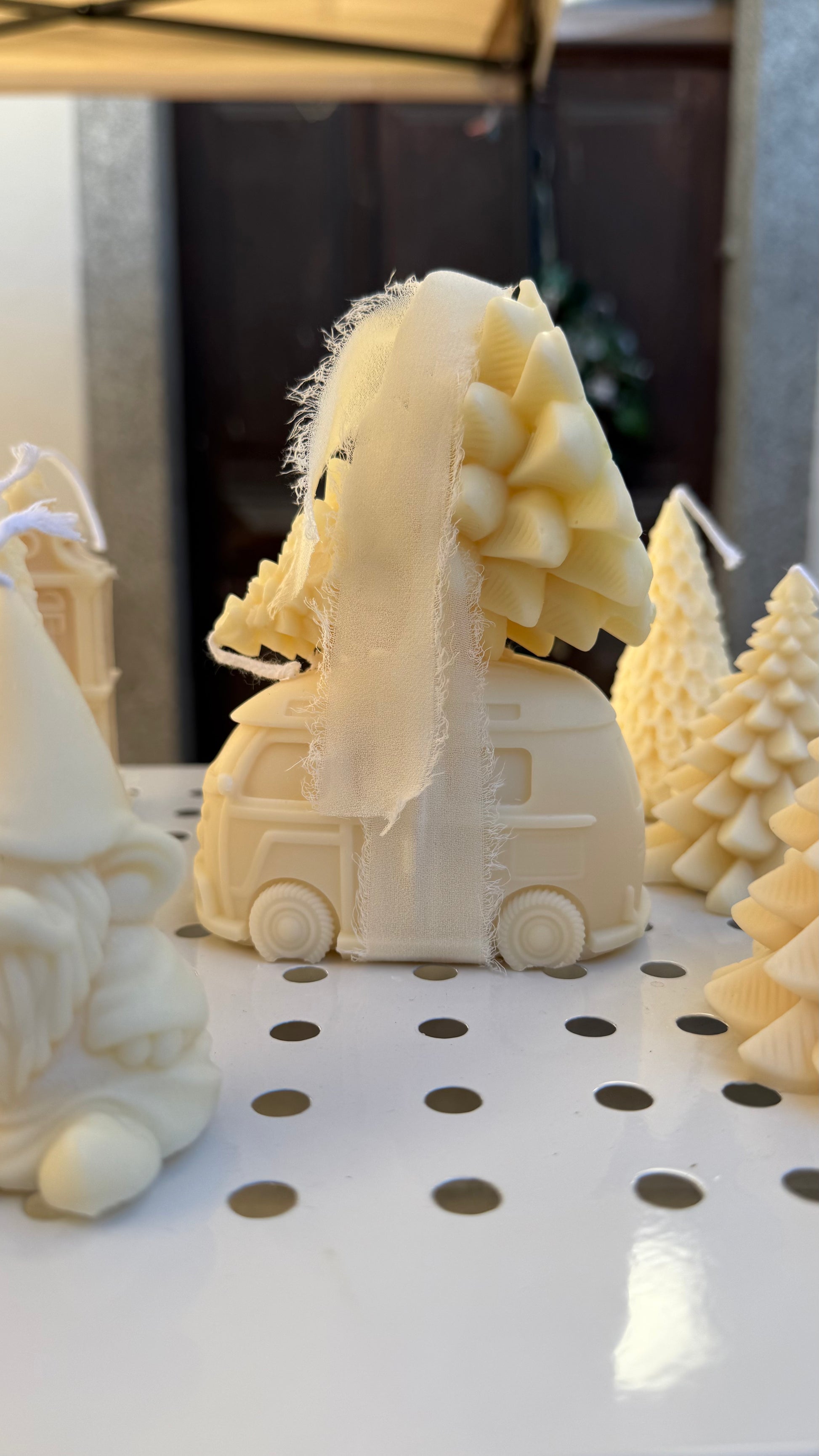 Plongez dans une ambiance chaleureuse et résolument hivernale avec ce duo de bougies décoratives composé d’un van iconique esprit Combi et d’un sapin de Noël.